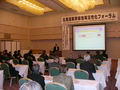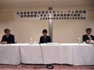 北海道新幹線開業はこだて活性化協議会の主催によりホテル函館ロイヤルにおいて開催された同シンポジウムには約200名の市民が参加、はじめに日本政策投資銀行の藻谷浩介氏より同タイトルでの基調講演をいただき、2015年度に予定されている北海道新幹線新函館駅(仮称)開業にむけ策定した「北海道新幹線開業はこだて活性化アクションプラン」の内容を、プレゼンテーションならびにパネルディスカッションを通じて広く地域にアピールしました。