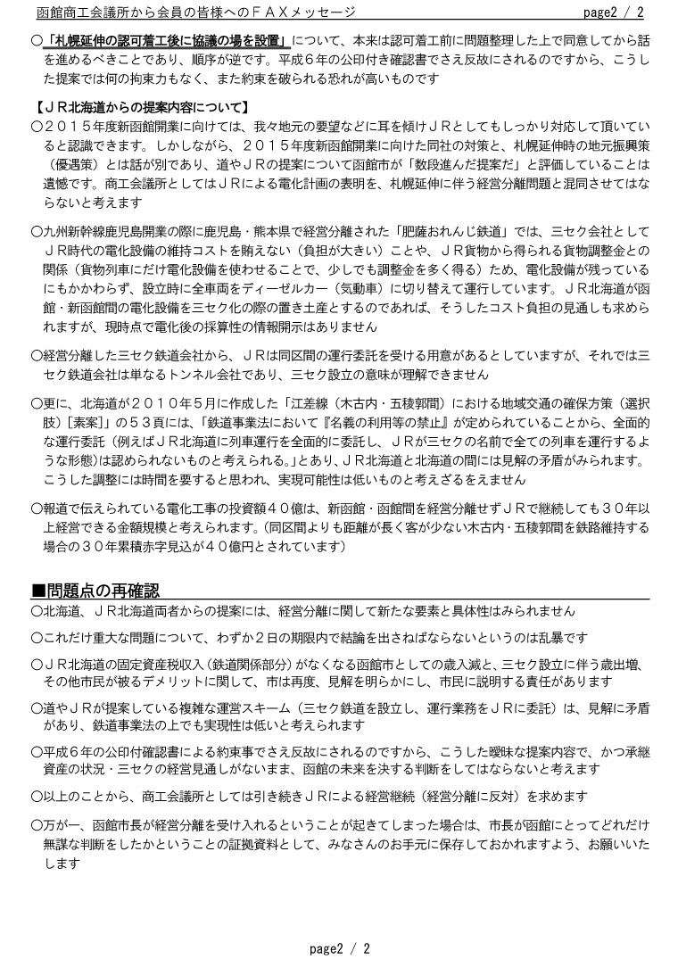 2010年(平成22)3月から始まった、北海道新幹線札幌延伸に伴う現函館・新函館間JR経営分離に反対する運動(JR経営継続運動)については、本日12月21日、函館市工藤市長が経営分離への同意を表明し、当所としての運動の一つの区切りとなりました。活動の経緯や周辺の動きは、総括特集として2012年1月中旬発行の会報「ともえ」記事に掲載の予定ですが、工藤市長の経営分離同意表明を受けて同日行った報道記者会見における松本会頭のコメント要旨をここに紹介いたします。